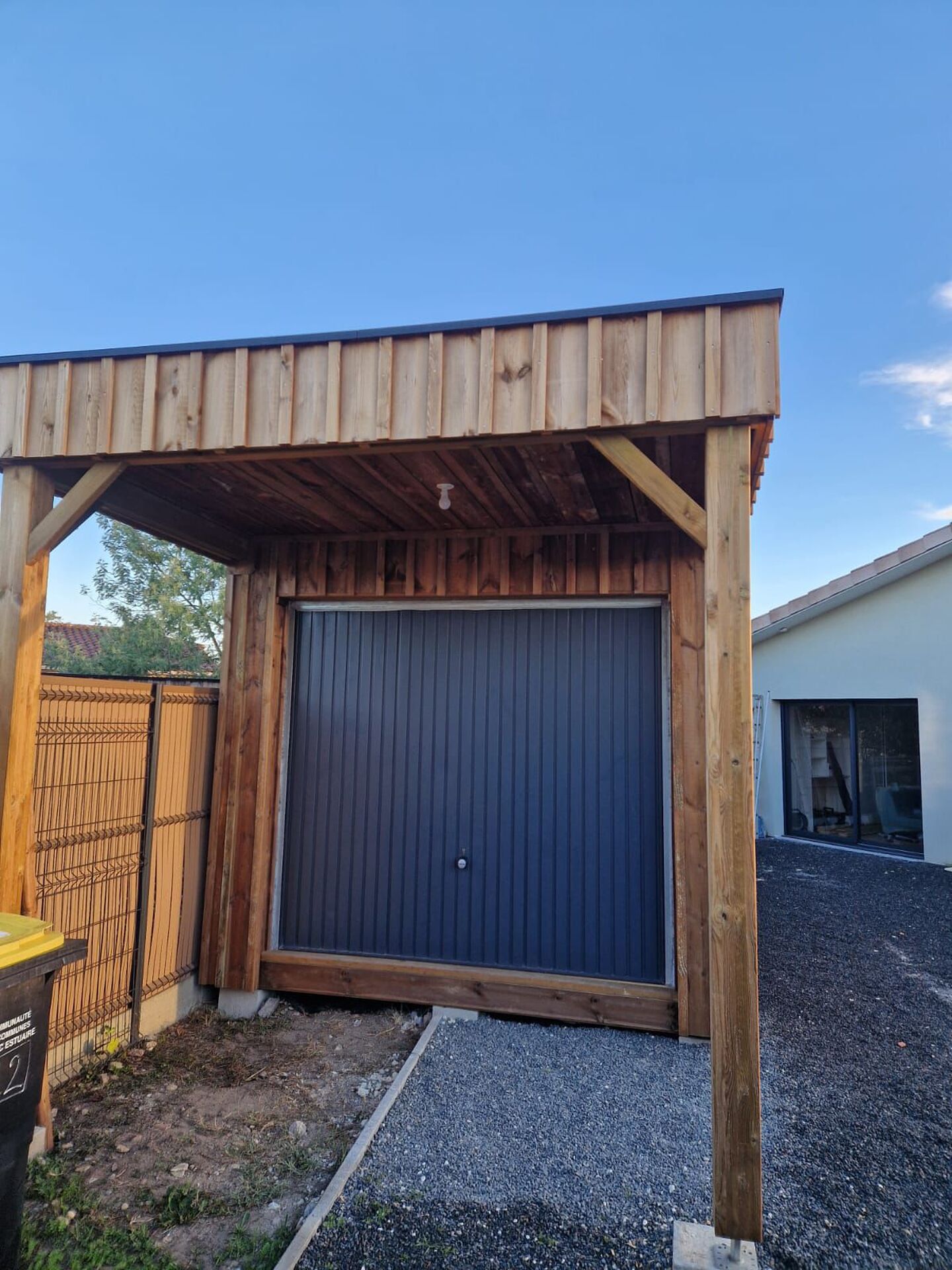 Nous réalisons la création de garage en ossature bois, avec un bardage en volige couvre-joint pin marron pour un rendu naturel, chaleureux et élégant.